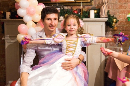 Да, мы с папой играем, я его даже обыгрываю! Когда он к нам приходит, ставим в комнате такие большие подушки от дивана вместо ворот. И еще одной закрываем телевизор, чтобы мячом не попасть. Еще мы с папой любим в киношку ходить, на аттракционы или в кафешку какую-нибудь.