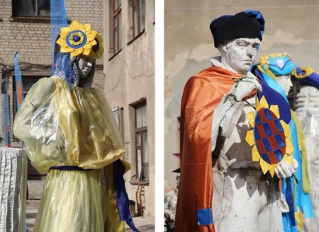 Фото: ksada.org На создание настенного рисунка третьекурсницу ХГАДИ Анну Кругляк-Дригу вдохновила известная песня "Синяя птица" группы "Машина времени". "В песне птица цвета ультрамарин символизирует счастье. Я решила связать ее с городом", — говорит художница. Лодка, в которой все делают вместе Фото из архива Е. Перепелицы Лодку Екатерина Перепелица изобразила неслучайно, ведь пятикурсница увлекается байдарочным спортом. "Когда люди плывут в лодке, они должны следить за многими вещами, чтобы она не перевернулась. Все это нужно делать сообща, как и в жизни. Лодка — наш путь, и чтобы все было хорошо, люди должны следить за этим вместе", — пояснила нам автор. Куб-гигант соединяет технику и искусство Фото: ksada.org Кубик Рубика высотой в полтора метра собрала из 45-ти деревянных планшетов и обтянула пленкой от натяжного потолка студентка четвертого курса ХГАДИ Катерина Иорганская. По словам Кати, ее работа символизирует соединение интеллекта, техники и искусства. "Дизайн — это непросто, им занимаются люди, обладающие знаниями в этих сферах. А почти не повторяющиеся цвета на кубе — это комбинация направлений дизайна", — пояснила автор. Скульптуры превратили в манекены Фото: ksada.org К студентам-художникам и графическим дизайнерам присоединились и молодые кутюрье. Свои смелые идеи они представили, превратив в арт-объекты скульптуры во дворе академии. Кроме того, вчера молодые модельеры из разных вузов Украины представили свои наряды на специальном показе в рамках дизайнерского форума.