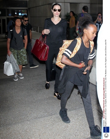 Актриса Анджелина Джоли, вес которой вызывает тревогу у поклонников по всему миру, была замечена вместе с детьми в аэропорту Лос-Анджелеса. Семья прилетела из Камбоджи, где проходили съемки нового фильма актрисы. Вместе с Анджелиной путешествовали 14-летний Мэддокс, 11-летний Пакс, 10-летняя Захара и 9-летняя Шайло. Дети сами несли свой багаж. Худощавая Джоли была одета в черные брюки и легкий свитер. Под вспышками фотокамер виднелся белый бюстгальтер. В руках сильно похудевшая актриса держала бордовую сумку от Alexander McQueen стоимостью 1780 евро. Фото: REX Фото: REX Фото: REX