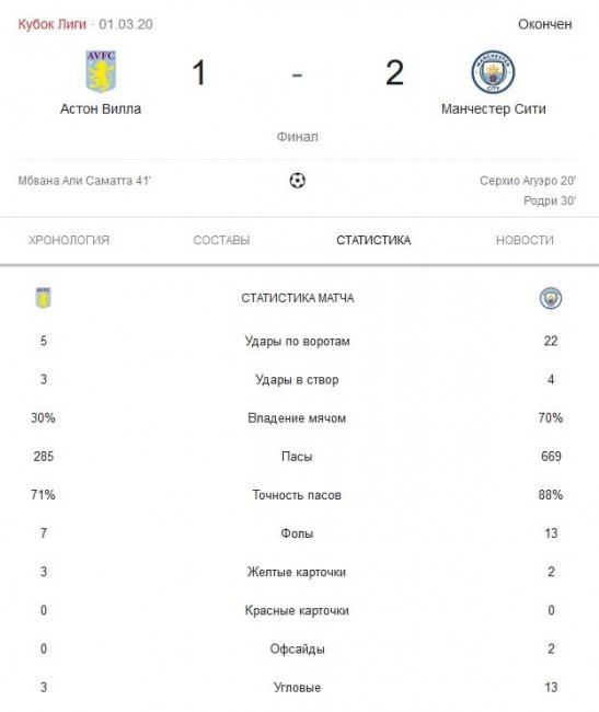 «Горожане» полностью переиграли своих оппонентов. Они владели инициативой в течение всего противостояния и победили благодаря голам Стоунза на 50-й минуте и Луиса Фернандо на 83-й минуте.