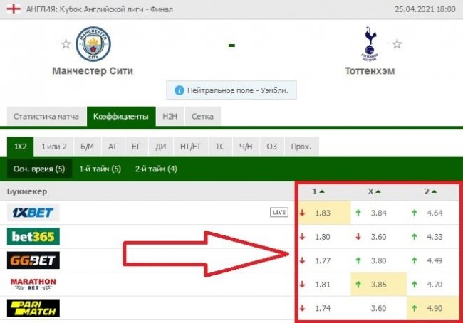 При совершении прогноза я первым делом смотрю букмекерские котировки. Давайте узнаем, что предлагают конторы на основные исходы финального матча:
