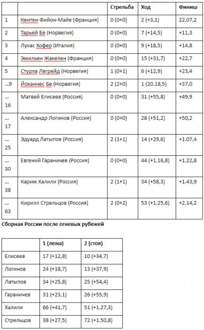 И это Матвей еще действительно старался, грамотно распределяя силы и обойдясь без привычных для «затыков» на финишном круге (которые, признаем справедливости ради, похоже все-таки уходят в прошлое). Но даже чистая и быстрая стрельба, и старт в первой группе, куда скучковались все фавориты (боясь, что в условиях теплой погоды трасса очень быстро разобьется в водянистую кашу), не помогли. С нулем в графе «промахи» Елисеев остался… только 16-м! Проиграв почти минуту победителю - Кентену Фийону-Майе.
