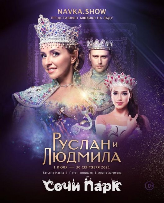 «Руслан и Людмила» - один из самых зрелищных и масштабных проектов за всю историю ледовых шоу будет показан на территории главного в России тематического парка развлечений «Сочи Парк» с 1 июля по 30 сентября 2021 года. В ярком и неповторимом мюзикле на льду принимают участие фигуристы мирового уровня. Главные роли исполнят трехкратная чемпионка России, трехкратная чемпионка Европы, двукратная чемпионка мира, олимпийская чемпионка Татьяна Навка, чемпионка Европы в одиночном катании, чемпионка мира и Олимпийских игр Алина Загитова, пятикратный чемпион США, двукратный победитель чемпионата четырех континентов Петр Чернышев, а также титулованная российская танцевальная пара чемпионы России, трехкратные бронзовые призеры первенства Европы, серебряные призеры Чемпионата Европы Александра Степанова и Иван Букин.